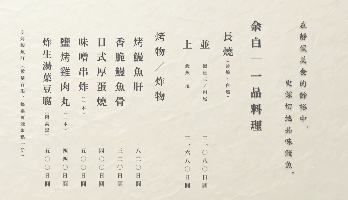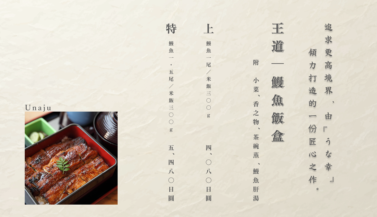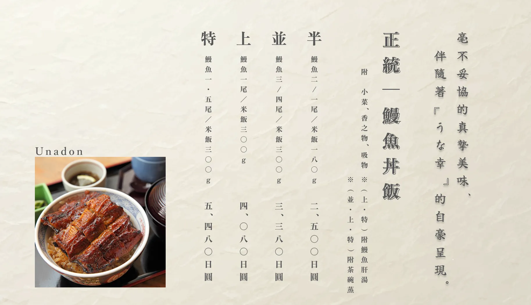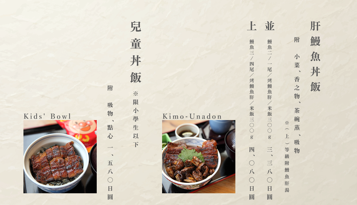 午餐:11:00 – 14:00 (最後點餐 13:30) 晚餐:16:30 – 19:30 (最後點餐 19:00) ※鰻魚售完即提早結束營業。 |