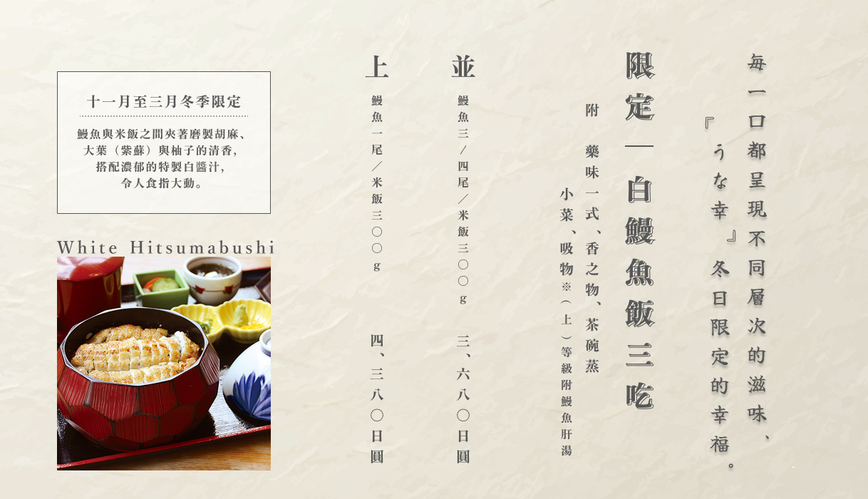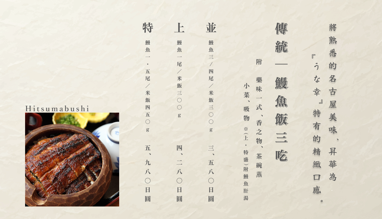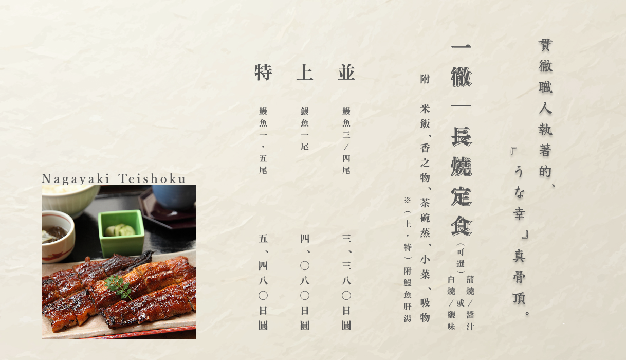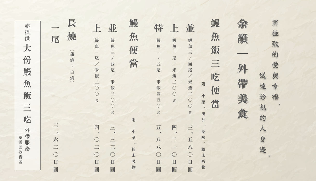 午餐:11:00 – 14:00 (最後點餐 13:30) 晚餐:16:30 – 19:30 (最後點餐 19:00) ※鰻魚售完即提早結束營業。 |